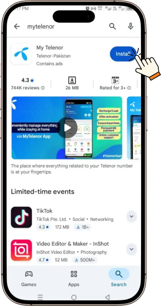 First, you need to go to your Google Play Store or Apple App Store and search for “My Telenor App.” Press Install to start the download automatically. Make sure to choose only the official Telenor Pakistan app.