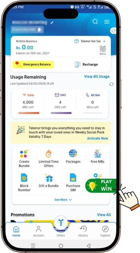Once the app is downloaded, open it and enter your Telenor Number. You will receive a verification code. After verification, you will be logged in to the app. It’s a one-time process.